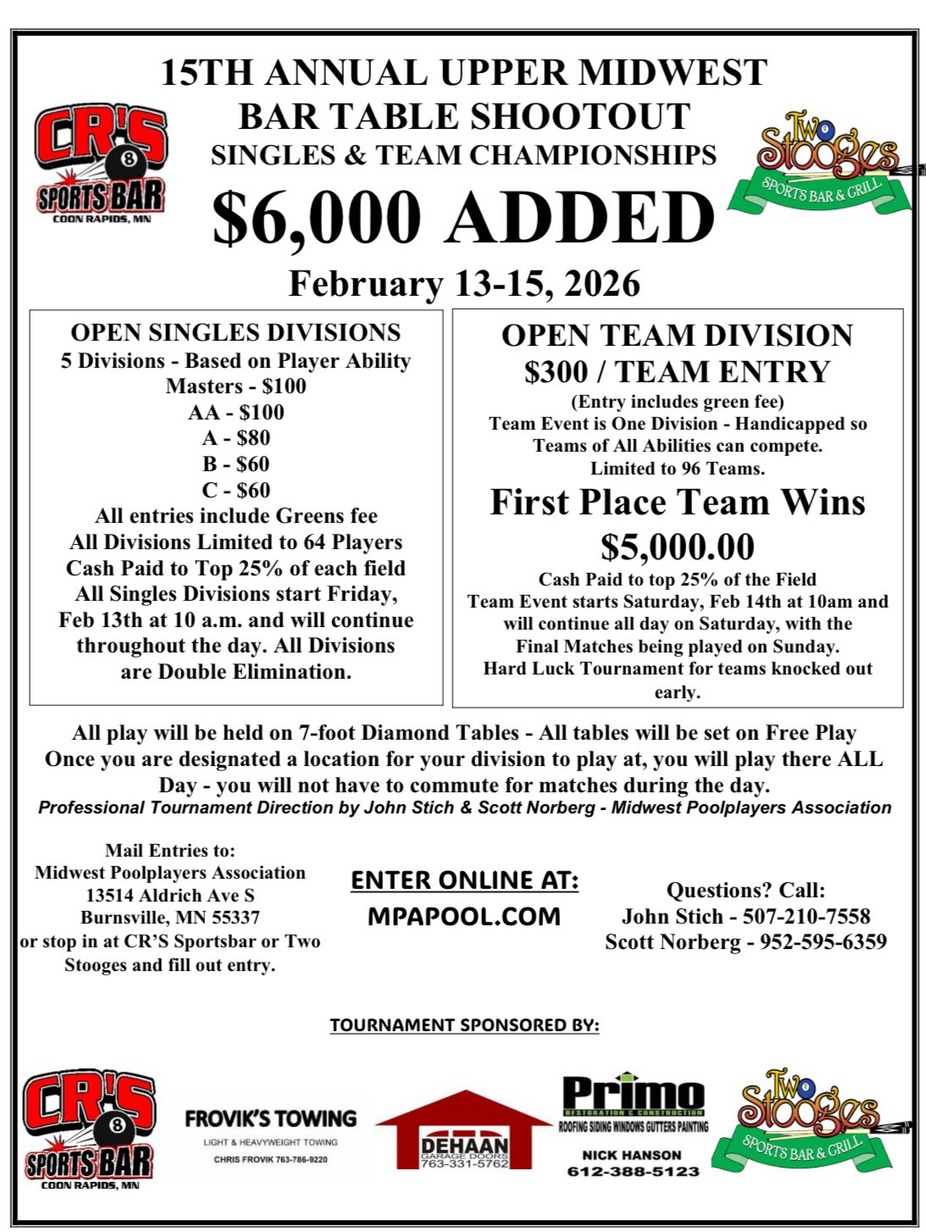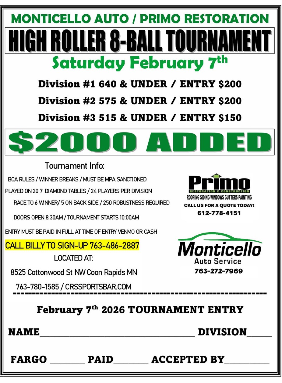 Saturday, February 7th- Join us for a High Roller 8-Ball Tournament! BCA Rules, Winner Breaks, Must be MPA Sanctioned. Doors open at 8:30AM, Tournament starts at 10AM. Call or Text Billy to sign up! 763-780-1585