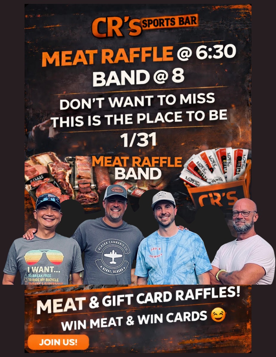 Get ready for a night of excitement with the Meat Raffle Band and a Meat raffle!! Meat raffle starts at 6:30 and the band kicks off at 8 PM at CR's Sports Bar! Gather your friends and make sure to call ahead to secure a table for an unforgettable evening of fun and entertainment. Saturday, January 31st!