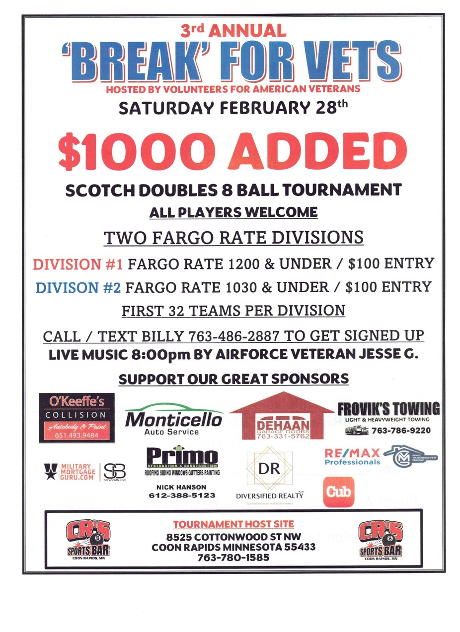 3rd Annual 'Break' For Vets on Saturday February 28th! $1000 Added - Don't miss out!